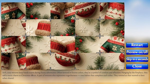 Вас ждет волшебная зимняя страна чудес! Собирайте мерцающие драгоценные камни, открывайте праздничные бонусы и знакомьтесь с очаровательными персонажами, работая над восстановлением самого уютного дома для отдыха в этом сезоне. В игре есть режим без времени.